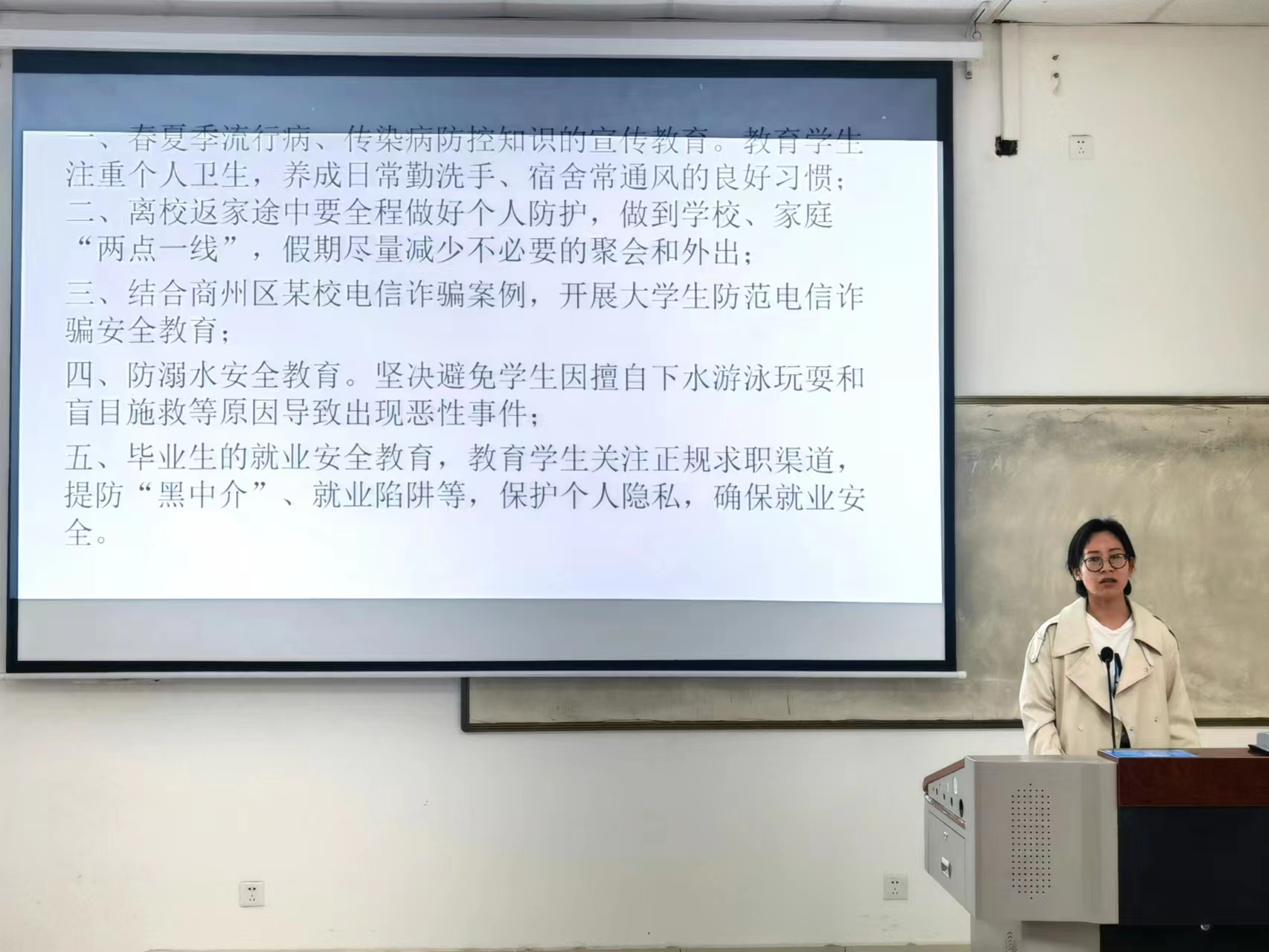 为增强我院学生假期安全意识,提高安全防范能力,4月27晚,我院在8号教学楼多媒体27教室召开了五一节前安全教育班会,我院2020级、2021级,2022级全体学生参加,由团总支书记王然主持。